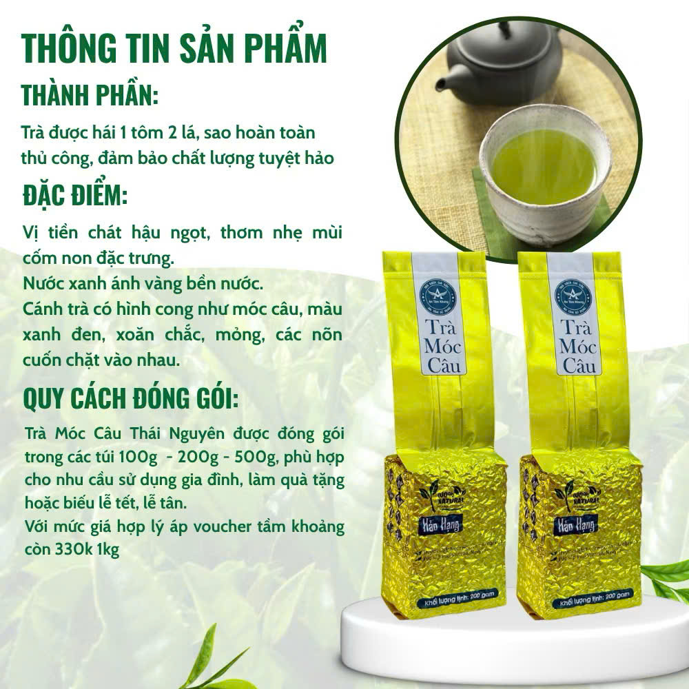 Trà Móc Câu Hảo Hạng An Tâm Khang được thu hái thủ công vào sáng sớm từ búp trà 1 tôm 2 lá non vùng trung du Thái Nguyên – nơi có khí hậu mát mẻ, sương sớm trong lành và đất đồi màu mỡ.