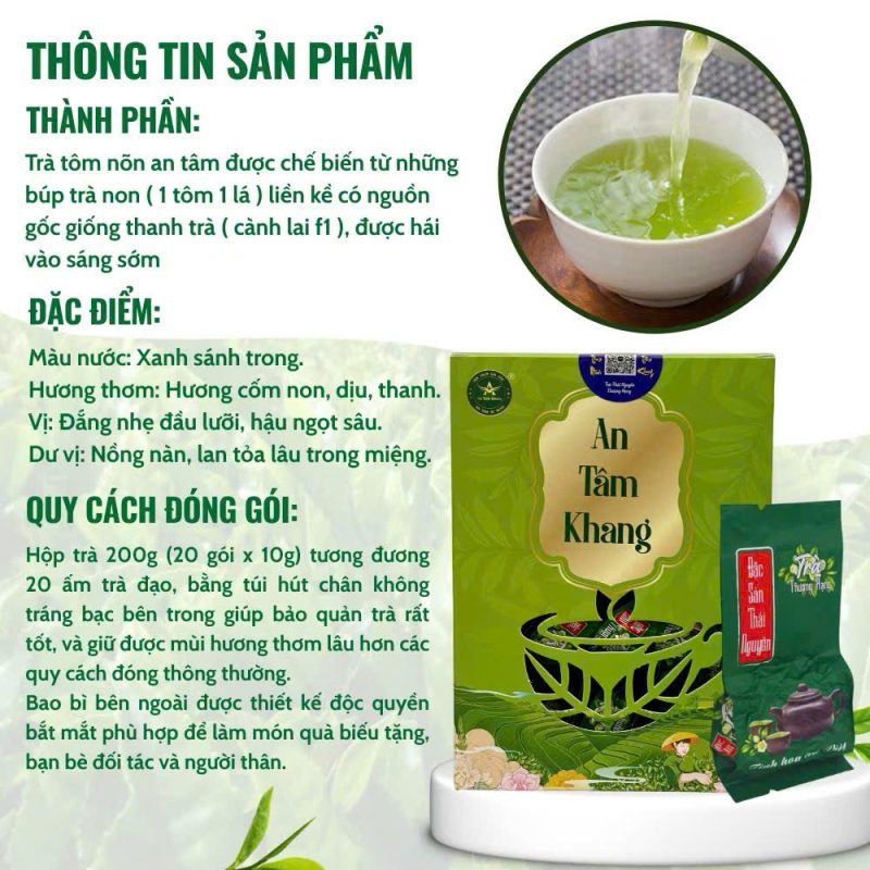 Trà Tôm Nõn Cao Cấp An Tâm Khang được làm từ những búp non “1 tôm 1 lá” hái tay vào sáng sớm tại vùng chè Phổ Yên – Thái Nguyên. Nhờ quy trình chế biến thủ công, giữ nguyên hương vị tự nhiên, trà mang đến cảm giác thanh khiết, dễ uống và giàu dưỡng chất từ lá trà non.