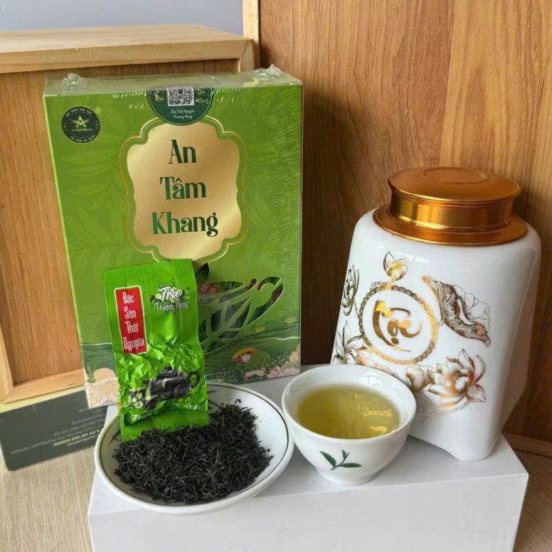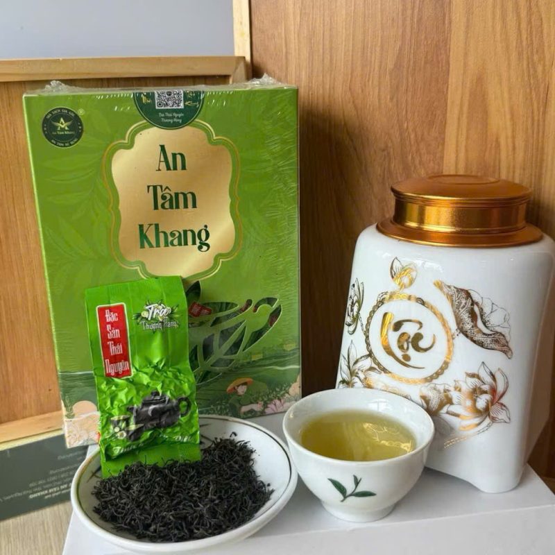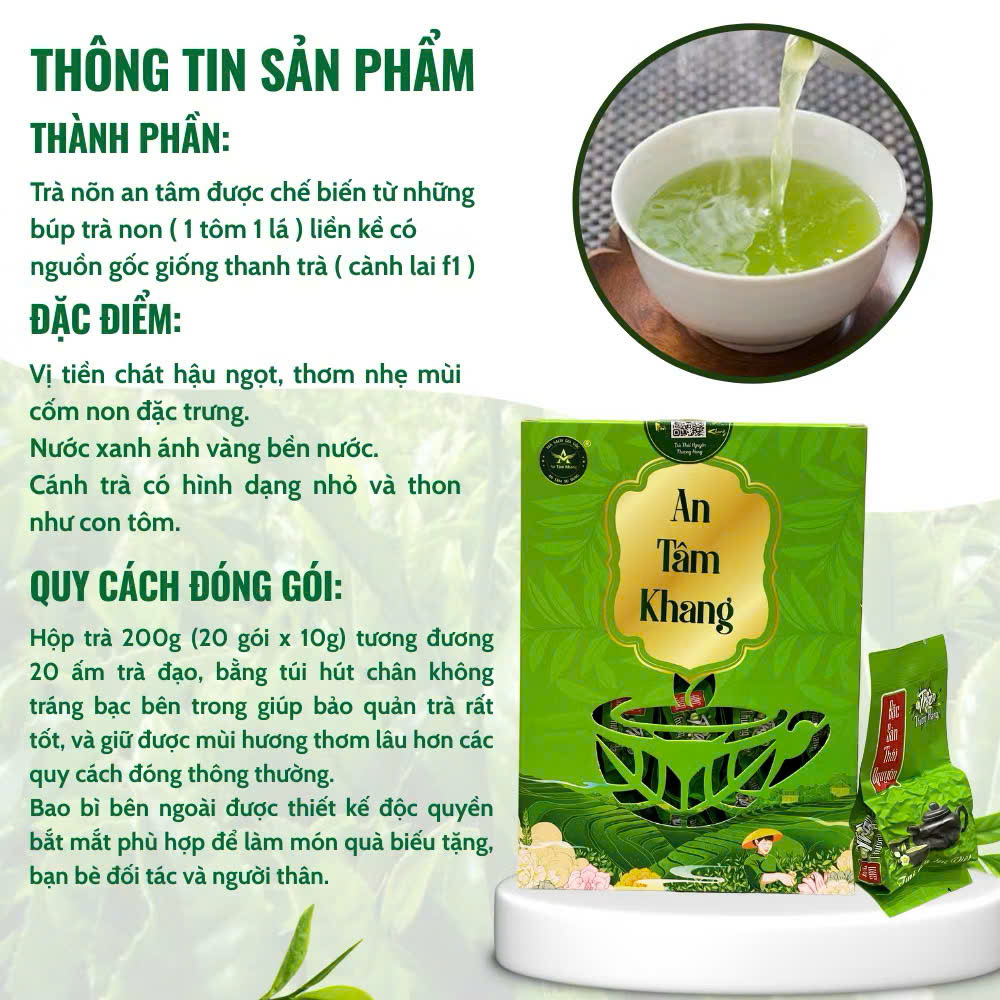Trà Tôm Nõn An Tâm Khang được hái từ những búp trà non 1 tôm 1 lá tại vùng Phúc Thuận – Phổ Yên – Thái Nguyên. Nhờ sao tay truyền thống, trà giữ được màu nước xanh vàng nhẹ, hương cốm thoang thoảng, vị chát dịu – hậu ngọt tự nhiên, chuẩn vị trà xanh Thái Nguyên.